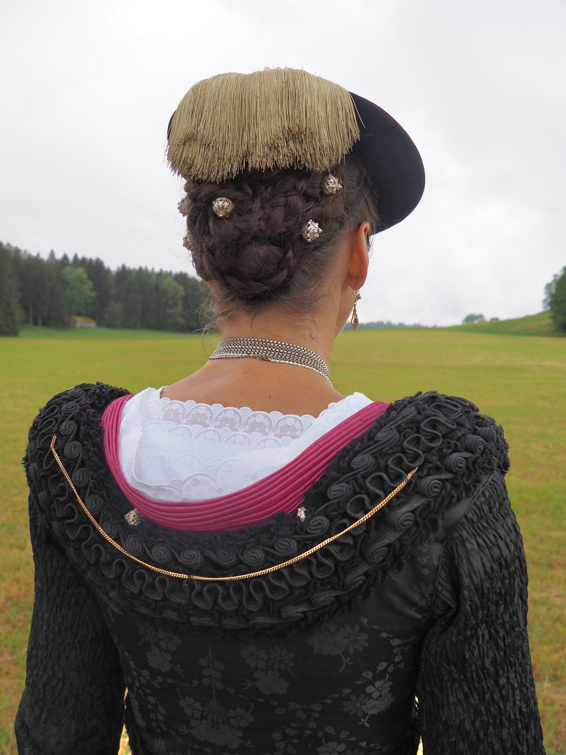 grünes Mieder, rosa Schürze und Tuch, schwarze Spitze, Schnurhut, schwarze Strumpfhose